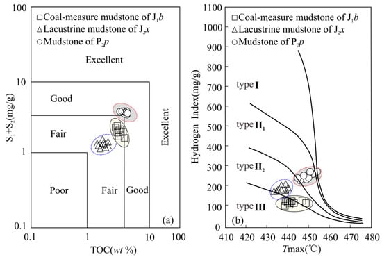The TOC content, S1 + S2, of the coal-measure mudstone of the Badaowan Formation ranged from 2.47% to 3.14% (avg. 2.83%) and 2.04 to 2.61 mg/g (avg. 2.31 mg/g), respectively (Figure 4a and Table 2). As shown in Figure 4a, the rock samples were identified as fair to good source rocks [,]. The value of the Hydrogen Index (HI) and the Tmax from the coal-measure mudstone ranged between 104.24 and 133.11 mg/g (avg. 117.71 mg/g) and between 439 and 449 °C, with a mean value of 442 °C, respectively. The low HI value reflected the existence of a large number of terrigenous plants in the parent source []. In addition, in the combined HI versus Tmax kerogen type classification diagrams, the Badaowan Formation rock samples represented type II2-III kerogen (Figure 4b) [,].