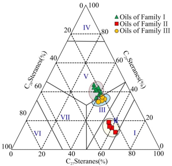 C27, C28, and C29 show the origin of organic matter in oil samples. (I: Terrestrial plant, Ⅱ: Mainly terrestrial plant, Ⅲ: Mixed source, Ⅳ: Phycophyta, Ⅴ: Mainly Phycophyta, Ⅵ: Plankton, Ⅶ: Mainly Plankton.).