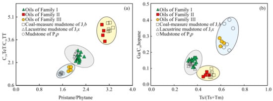 The intersection diagram of the Pr/Ph versus C24TeT/C26TT and the Ts/(Ts + Tm) versus Ga/C30-hopane jointly indicated that the oil samples of the Family I derived from the lacustrine mudstone of the Xishanyao Formation, the oil samples of Family II came from the typical coal-measure mudstone of the Badaowan Formation, and the oil samples of Family III originated from the mudstone of the Pingdiquan Formation. This also further supports the above conclusions (Figure 7).
