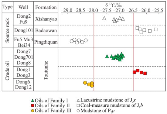 The carbon isotope composition of the kerogen in Jurassic source rocks is relatively heavy as a whole, in which the isotope value of the Badaowan Formation was −25.0‰~−28.0‰, and that of the Xishanyao Formation was −26.0‰~−29.0‰. However, the carbon isotope value of the Permian Pingdiquan Formation was relatively light, mainly concentrated at −27.0‰~−32.0‰. The mid-range of the δ13C ratios of the Family I oil ranged between −27.5‰ and −26.8‰; they were related to the lacustrine mudstone of the Xishanyao Formation. The δ13C values of the Family II oil samples varied from −26.5‰~−26.1‰, showing good affinity with the δ13C of the coal-measure mudstone of the Badaowan Formation. The crude oils of the Family III had light δ13C values, which indicated that the oils had the same characteristics as the mudstone of the Pingdiquan Formation (Figure 8).