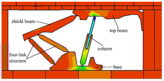 Based on the actual working characteristics and size of the shield, a two-dimensional numerical model of the shield is established in the CDEM simulation software, as shown in Figure 1. The top beam, column, base, shield beam, and four-link structure of the shield can be linked with the lifting of the column. In the numerical simulation, the shield parameters refer to steel. The main parameters are the elastic modulus of 200 GPa, tensile strength of 1.23 GPa, and cohesion of 2.24 GPa. The setting and yield load are set on the shield column, and the direction of the force is along the column axis, which is consistent with the actual working characteristics of the shield [15,16].