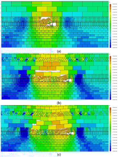 The aforementioned eight numerical models were carried out; the simulation results for 4.5 m mining height are presented as an example. Figure 3 is a partially enlarged view of the surrounding rock structure failure when the numerical model was excavated at different advance distances. When the working face advanced to 10.38 m, as shown in Figure 3a, the immediate roof collapsed; when the deformation of the basic roof was not large, no collapse occurs. When the working face was excavated at 37.195 m, as shown in Figure 3b, the basic roof was broken for the first time, the shield column shrank significantly, and the shield resistance was large, which was called the first weighting of the working face. When the working face was excavated for 49.305 m, as shown in Figure 3c, the basic roof was broken for the second time, and the first periodic weighting of the working face was carried out.