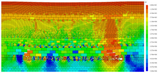 To reduce model boundary effects, the distance from the left boundary to the initial coal face was set at 50 m, and the cutting depth of the shearer was 0.865 m each time. A total of 230 excavation steps were about 200 m away to achieve full mining of the overlying strata of the coal seam. The simulation results intuitively reflected the movement and deformation law of coal and rock strata and can clearly observe the collapse range of the overlying strata and the development height of fractures.