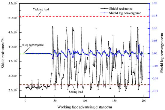 In the following data analysis, according to the inclination angle of the shield model column under different mining height conditions in the simulation, the shield setting and yield load along the direction of the column was multiplied by the sine value of the inclination angle of the column, which was converted into the resistance in the vertical direction, as to be consistent with the direction of the shield resistance value monitored in the numerical simulation.
