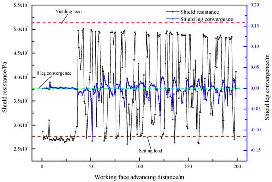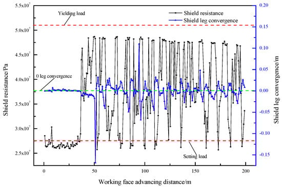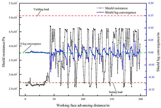 Changes of shield resistance and leg convergence under 7.0 m mining height.
