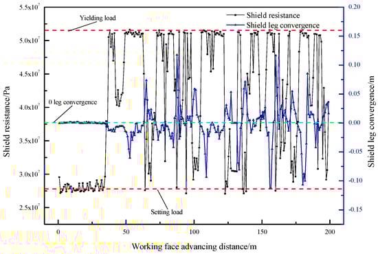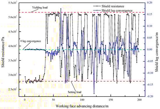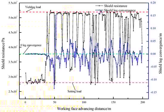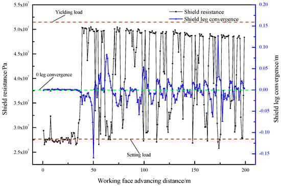 Changes of shield resistance and leg convergence under 2.5 m mining height.