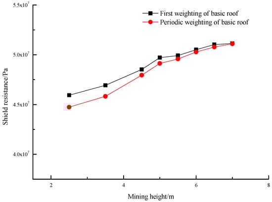 When the coal mining working face was under the basic roof weighting, the shield resistance was relatively large, thus the shield type selection was generally carried out according to the maximum strength of the shield during the basic roof weighting stage, which had a guiding significance for field engineering applications. Figure 14 shows the comparison of the shield resistance at the first and periodic weighting of the basic roof under different mining height conditions. It can be seen from the figure that the resistance of the shield at the first weighting of the basic roof was greater than that of the periodic weighting, but the difference between the two was not significant.