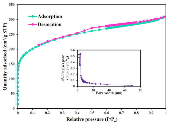 The MCAC’s surface area and porosity play a key role in the adsorption of the MV 2B dye [26]. The specific surface area and pore structure characteristics of MCAC are summarized in Table 3. The estimated pore volume and specific surface area of MCAC were 0.440 cm3/g and 798.18 m2/g, respectively. As per IUPAC [27], MCAC has a mesoporous structure (pores ranging in size from 2.0 nm to 50 nm), as evidenced by the mean pore diameter result (3.67 nm). Figure 1 shows the nitrogen adsorption/adsorption curves of MCAC, along with the BJH pore width distributions (inset). Figure 1 of the MCAC illustrates a Type-IV isotherm, which denotes the existence of mesopores in the structure [27]. Additionally, the H4 hysteresis loop’s occurrence over the relative pressure (P/Po) range studied demonstrates that the MCAC contains slit-like pores [28]. In general, the high porosity, increased pore size, and high specific surface area of the MCAC product affords many binding sites that may efficiently react with MV 2B organic dye molecules. The specific surface area of MCAC was also compared with other adsorbent materials and listed in Table 4.