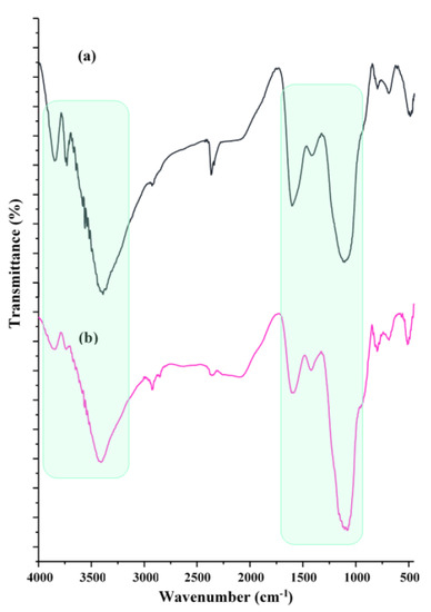 Figure 2. FTIR spectra of (a) MCAC and (b) MCAC after MV 2B adsorption.