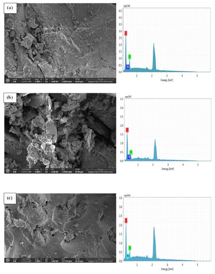 SEM-EDX analysis was used to explore the morphological changes and chemical nature of MC and MCAC before and after the adsorption of MV 2B. Figure 3 presents SEM images of MC and MCAC before and after the adsorption of MV 2B. In Figure 3a, it can be seen that MC has a homogeneous surface. According to Figure 3b, the morphological characteristics of MCAC were obviously changed to be more diverse, with the obvious occurrence of porosity and cracks, which indicated the successful conversion of MC to MCAC. The morphological properties of MCAC were altered to be more compact following the adsorption of MV 2B (Figure 3c), with a clear reduction in porosity and fractures, which revealed MV 2B dye loading on the surface of MCAC. The major elements of MC, MCAC, and MCAC-dye are carbon, oxygen, and nitrogen, as shown by their EDX spectra.