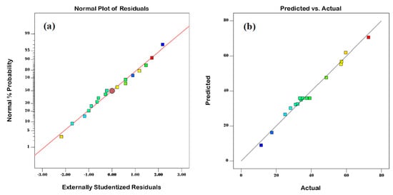 The model created must be further assessed by looking at the normal probability plot (Figure 4a) to make sure the residues are approximately normally distributed. The normal distribution of the values in Figure 4a along a straight path shows that the model building and the ANOVA findings are adequate and plausible [38]. Another feature to evaluate the efficacy of the developed model is the expected versus the actual plot, as illustrated in Figure 4b. The plot, which has good linearity as depicted in Figure 4b, reveals that the experimentally obtained data are in excellent agreement with the calculated data by the BBD model.