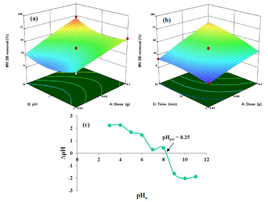 Three-dimensional (3D) response surface diagrams were created to better understand how the parameters under examination impact MV 2B removal and to find significant relationships between the variables under examination. In the 3D graph of Figure 5a, the simultaneous impact of the MCAC dosage and pH on the rate of MV 2B removal is depicted while the duration (15 min) was maintained constant. Figure 5a demonstrates that eliminating MV 2B from a basic solution with a pH of 10 causes a greater adsorption capacity for MV 2B. According to Figure 5c, which shows that the pHpzc of MCAC is 8.25, for pH values greater than 8.25, the surface of the MCAC is occupied with negative charges and tends to adsorb positive MV 2B molecules. These findings demonstrate that the electrostatic interaction when the pHpzc of MCAC is lower than the pH, as described in Equation (5), and this contributes considerably to the adsorption process.