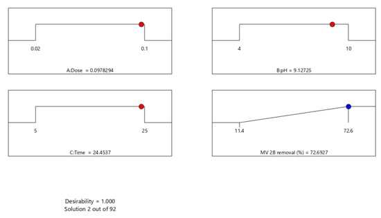 where D indicates general desirability, n indicates response count, and di indicates independent desirability. The objective is to identify when desirability is most significant. The most efficient response for the reaction known as MV 2B removal (%) is produced by continuously optimizing inputs. A detailed description of this strategy was provided in prior research [39]. According to the numerical desirability function of the BBD model, the MCAC dosage (0.097 g), pH (9.12), and duration (24.4 min) were the circumstances that resulted in the best decolorization of MV 2B (90.0%) where the desirability value equals 1 (see Figure 6). In general, the data that were obtained by numerical optimization applying desirability functions concur with the results of empirical measurements. These results indicate that combined with the desirability function, the BBD model could optimize MV 2B adsorption via MCAC. Consequently, the optimum input parameters for MV 2B adsorption were utilized in the adsorption studies.