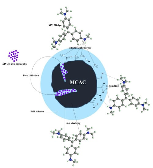 Organic dyes (such as MV 2B dye) are typically adsorbed onto porous ACs through a variety of important interactions, such as electrostatic attraction, π-π stacking, hydrogen bonds, and pore diffusion [54]. Figure 8 shows the important interactions that are involved in the MV 2B adsorption. The molecular diameter of MV 2B is 1.24 nm, while the MCAC has a porous structure (mean pore width = 3.67 nm). As a consequence, MV 2B molecules can readily occupy the mesopores in the MCAC. According to the MV 2B adsorption results, the adsorption process took place in a basic environment (pH ˃ pHpzc). Electrostatic interactions make a significant contribution to the process that occurs in this medium and are critical for MV 2B adsorption. The adsorption sites (functional groups) of MCAC will adopt negatively charged (e.g., –O– and –COO–) sites in this environment, whereas MV 2B exists as a cation. On the surface of MCAC, functional groups possessing the H atom can establish hydrogen bonds with the N atoms of the MV 2B dye molecule. MCAC’s hexagonal structure and the benzene rings of the dye interact as donors and acceptors of electrons in a π-π stacking arrangement which aids in improving the affinity of the adsorption of MV 2B [15].