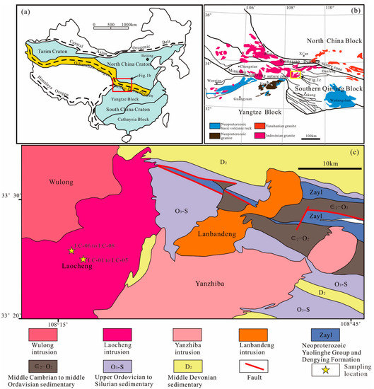 (a). Sketch Geological map of China, (b) geological map of the Qinling Orogenic belt and (c) the geological map of the Triassic Laocheng and Yanzhiba pluton.