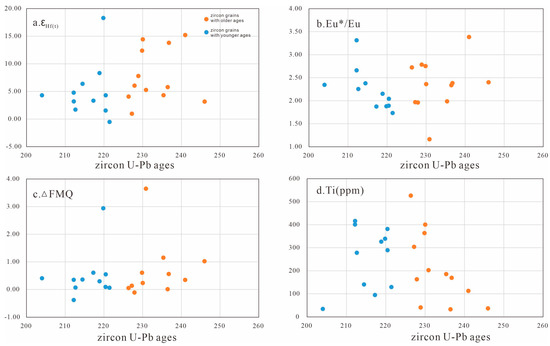 Zircon geochemical differences for the Laocheng appinite. Zircon U-Pb ages vs. εHf(t) (a), Eu*/Eu anomalies (b), △FMQ (c) and Ti contents (d) diagrams.