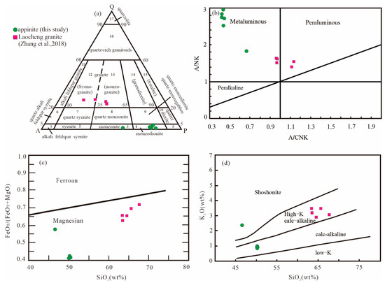 Plots of Q-A-P (a), A/NK [Al2O3/(Na2O + K2O)] vs. A/CNK (molar ratio Al2O3/(CaO + Na2O + K2O)); (b), SiO2-FeO/(FeO + Mg) (c) and SiO2-K2O (d) diagrams for the Triassic Laocheng appinite. The data of the Laocheng granite was from Zhang et al. [26].
