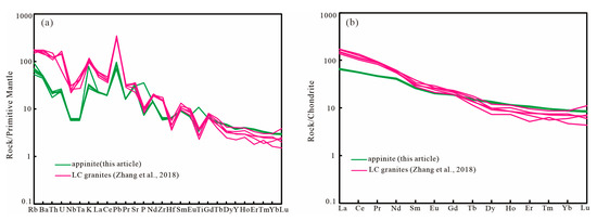 Chondrite-normalized REE patterns (a) and primitive mantle (PM) normalized trace element spider diagrams (b) for the Triassic Laocheng appinite. The data of the Laocheng granite was from Zhang et al. [26].