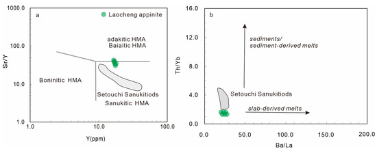 The appinites in orogenic belts are generally considered to be formed by the hydrous melting of the sub-arc mantle [4,8]. The Laocheng appinite has a basaltic composition, with low SiO2 (46.55 to 50.44%) contents and high Cr (599 to 680 ppm), Ni (121 to 130 ppm) and Co (50.1 to 52.7 ppm) contents; these features are identical with the primitive melts that derived from the melting of the metasomatized mantle wedge [5]. Its depleted zircon Lu-Hf isotopic compositions (εHf(t) = +0.97 to +18.21) indicate a depleted mantle source. As shown in the Ba/La vs. Th/Yb discrimination diagram (Figure 9b), the Laocheng appinite displays low Th/Yb and Ba/La ratios. This is identical with the Setouchi sanukitiods in SW Japan [24], suggesting that sediment-derived fluid and melts are not the metasomatis agent.