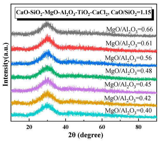 Based on the composition of blast-furnace slag in a domestic iron and steel enterprise (as shown in Table 1), the experimental scheme is designed to study the influence of the variation of slag composition on the performance of chlorine-containing high-titanium slag. The experiment is prepared with analytical pure reagents SiO2, CaO, MgO, Al2O3, TiO2 and CaCl2. SiO2, CaO, MgO, Al2O3 and TiO2 are kept at 1000 °C for 5 h in a muffle furnace to remove water, and CaCl2 is dried at 105 °C for 5 h. According to the proportion set in Table 2, when the alkalinity (R2) of fixed slag is 1.15, w (Al2O3) is 11%–18%, w (MgO) is 7.26% and MgO/Al2O3 is 0.40–0.66. A 250 g slag sample is weighed and placed into a molybdenum crucible, which is then placed into a high-temperature box resistance furnace, and heated at 1500 °C under the protection of argon gas and is held for 3 h to ensure a more uniform slag composition. Water quenching is carried out immediately after heat preservation to maintain the state under high temperature, and then the obtained slag is dried and ground. The sample is ground to less than 200 mesh. After drying and grinding, the sample is divided into three parts. In the first part, the components of the chlorine-containing high-titanium slag are analyzed by X-ray fluorescence spectrum, as shown in Table 3, and the measured values are close to the experimental design values. In the second part, the XRD results of samples cooled down rapidly with the change of MgO/Al2O3, as shown in Figure 1. There is no fine spectral peak structure, and only a large envelope peak exists, indicating that all the slag samples are of amorphous glass state at high temperature. The last part is used to measure the viscosity of molten slag.