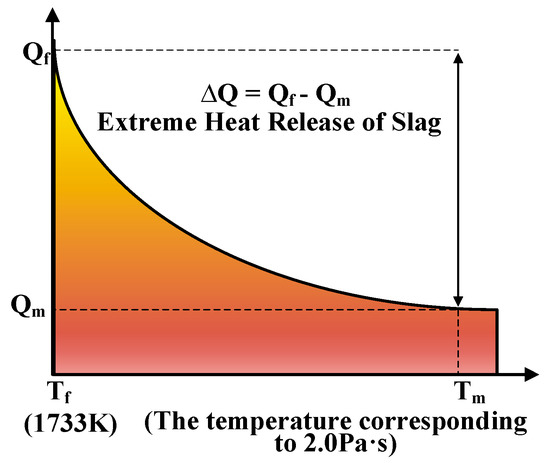 The good fluidity of slag is one of the preconditions to maintain the normal operation of blast-furnace smelting. The slag will inevitably be accompanied by heat loss in the flow process, which will lead to the increase of slag viscosity. In order to ensure the normal production of the blast furnace, the slag viscosity should be controlled below 2.0 Pa·s [9] during smelting. On the premise of ensuring the free flow of slag, the maximum heat release it can bear reflects the thermal stability of slag. Therefore, the slag thermal stability is quantified by slag extreme heat release [10]. Figure 2 shows the schematic diagram of slag extreme heat release. The temperature corresponding to the slag viscosity value of 2.0 Pa·s is Ts, and EHRS is expressed as the heat loss during the period when the slag tapping temperature (Tb) decreases to the minimum temperature (Ts). The larger the EHRS, the more heat loss the slag can bear, and the better the thermal stability of the slag.
