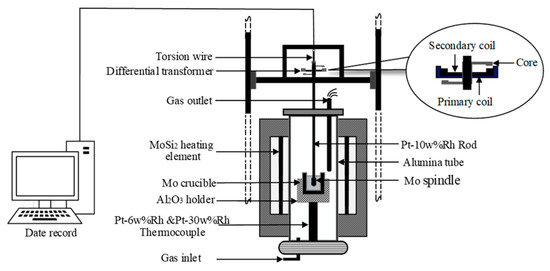 RTW-type melt physical property tester is used to measure the slag viscosity, as shown in Figure 3. The experimental equipment is mainly composed of high temperature heating furnace, torque sensor, control cabinet and software system. In this study, the heating element is U-shaped MoSi2, and the lower part of the furnace is equipped with a refractory base. Pt-6% Rh and Pt-30% Rh thermocouples are used to control the temperature in the furnace, and the measurement error is less than ±2 K. The suspension rod and molybdenum probe are suspended below the torque sensor, the motor drives the probe to rotate and output signals, calculate and record the viscosity value.