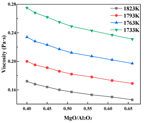 When the alkalinity is constant at 1.15, the MgO mass fraction is 7.26%, TiO2 mass fraction is 22.02%, and Al2O3 mass fraction is 11%–18%. The viscosity of chlorine-containing high-titanium slag (CaO-SiO2-MgO-Al2O3-CaCl2-TiO2) changes from 0.40 to 0.66 with the ratio of MgO/Al2O3, as shown in Figure 4. At the same temperature, the increase of MgO/Al2O3 reduces the slag viscosity. There may be three reasons for this. First of all, the higher the proportion of Al2O3, the easier it is to generate high melting point compounds, such as magnesium aluminum spinel (MgO·Al2O3) and calcium aluminate (CaO·Al2O3). These high melting point compounds have strong crystallization ability, and a large number of heterogeneous phases are generated. After crystallization, they will exist in the slag in a solid state, which makes the internal structure of the slag more complex and worsens the slag fluidity. Secondly, from a microscopic perspective, Al2O3 is an acid oxide that can absorb free oxygen ions to form a four-coordinated aluminum oxide tetrahedron structure, which supports the silicate network structure, enhances the complexity of the melt structure, and increases the slag viscosity. In addition, with the increase of temperature, the influence of MgOAl2O3 ratio on slag viscosity gradually weakens. When the temperature is 1733 K, the MgO/Al2O3 ratio increases from 0.40 to 0.66, and the slag viscosity decreases by about 0.05 Pa · s. When the temperature is 1823 K, the MgO/Al2O3 ratio increases from 0.40 to 0.66, and the slag viscosity decreases by about 0.03 Pa · s. The increase of slag viscosity means the deterioration of slag fluidity, which will also affect the stability and smooth running of the blast furnace to a certain extent. Therefore, in order to better improve the fluidity of the slag and maintain the smooth operation of the blast furnace, the proportion of MgO/Al2O3 in the slag must be controlled to avoid excessive Al2O3 composition.
