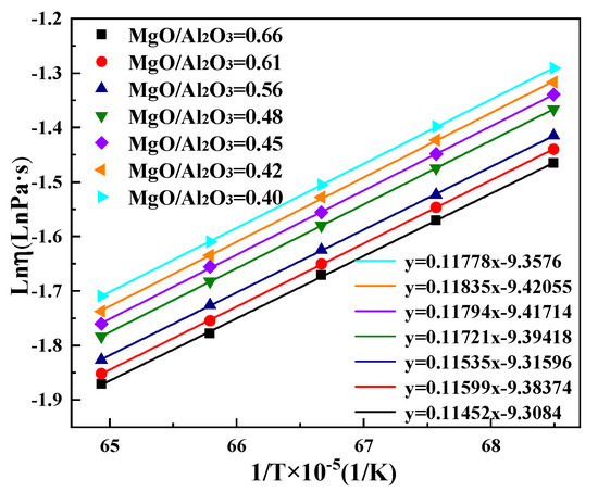 Figure 5 shows ln when MgO/Al2O3 changes η and 1/T. As can be seen from the figure, ln η is linear with 1/T. Calculate the viscous flow activation energy of slag with the fitting line (R2 > 0.99), where InA and Eη/T are the intercept and slope of the fitting line, respectively. The calculation results of viscous flow activation energy change with MgO/Al2O3 are shown in Table 4. As MgO/Al2O3 increases from 0.40 to 0.66, the corresponding viscous flow activation energy decreases from 98.75 kJ/mol to 95.21 kJ/mol. With the increase of the proportion of Al2O3, Al3+ combines with free oxygen ions to form complex aluminum oxide tetrahedral structural units. In order to maintain charge balance, Ca2+ is consumed for charge compensation, forming more complex structural units. The friction resistance of slag becomes larger when flowing, which worsens the fluidity of slag.