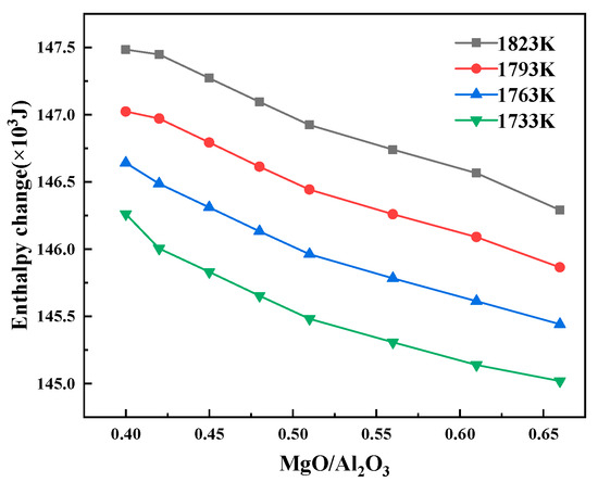 It can be seen from Figure 7 that when the temperature is constant, the enthalpy change of blast-furnace slag decreases linearly with the increase of MgO/Al2O3. When MgO/Al2O3 is constant, the enthalpy change of slag is obviously increased with the increase of temperature. This shows that increasing MgO/Al2O3 reduces blast-furnace energy consumption, especially when the increase of blast-furnace coal injection and the use of low-grade ore lead to the decrease of MgO/Al2O3 in slag, it is necessary to increase the supply of blast-furnace fuel.