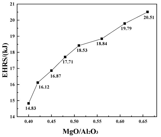Figure 8 shows the effect of MgO/Al2O3 on EHRS of high-titanium slag containing chlorine. The increase of MgO/Al2O3 obviously increases the slag EHRS value. MgO/Al2O3 increased from 0.40 to 0.66, and EHRS increased from 14.83 kJ to 20.51 kJ. The higher the EHRS value, the smaller the viscosity fluctuation caused by the change of slag composition or temperature. Therefore, when using high alumina ore for blast-furnace smelting, in order to maintain the stability of slag temperature and promote the stable operation of the blast furnace, it is necessary to appropriately increase the coke ratio or fuel ratio to maintain the smooth operation of the blast furnace.