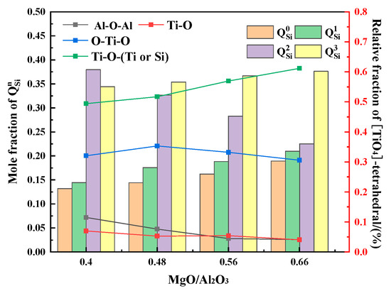 As shown in Figure 10, with the increase of MgO/Al2O3, the peak position in the Raman spectrum gradually moves to a lower wave number. Q0 and Q1 structural units are relatively reduced, Q2 structural units are relatively increased, Ti-O-(Ti or Si) structural units are increased, and Al-O-Al bonds are reduced. This shows that the slag structure is simplified. Al2O3 is an amphoteric oxide, which can play a role as a network builder when the slag is acidic, forming complex anion groups with free oxygen ions, thus making the slag structure more complex. When the slag is alkaline, it can play the role of network modifier to destroy the Si-O network structure and reduce the slag viscosity. Obviously, in this slag system, Al2O3 is an acid oxide, and Al3+ is dissociated to participate in the formation of [AlO4]5− tetrahedron structure. Moreover, due to the charge compensation effect, metal cations such as Ca will compensate the missing charge of Al3+ in the formation of four coordinated aluminum oxide tetrahedron structure, so the increase of MgO/Al2O3 makes the structural unit of the melt simpler to some extent.