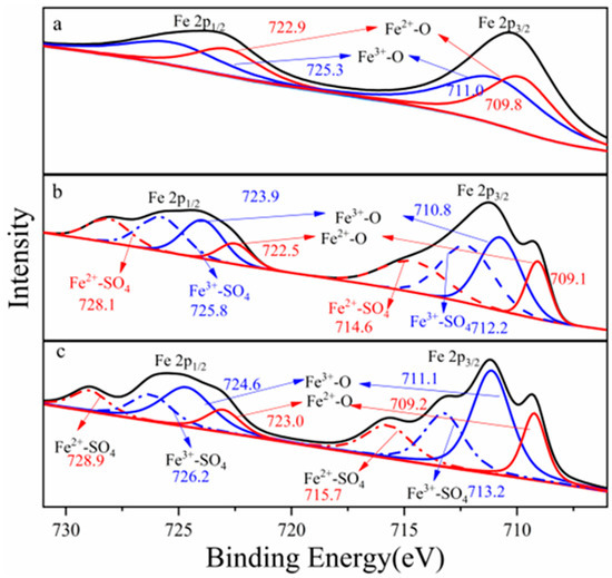Electron binding energy of Fe 2p, (a) ferrocolumbite, (b) 8 M H2SO4 acid leaching residue, (c) 12 M H2SO4 acid leaching residue.