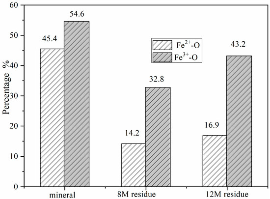 The content of Fe2+-O on the 8 M H2SO4 leaching residue surface decreased by 31.2% and 28.5% on the 12 M leaching residue, compared to the content of Fe3+-O which decreased by 21.8% and 11.4%, respectively. The results showed that the mineral structure with ferrous iron was much more easily broken, and relevantly easily leached. The Fe2+/Fe3+ ratio of leaching residues was smaller than that of the initial mineral, which meant the content of Fe3+ on the residues’ surface increased. The reasons were that more Fe2+ was soluble in the acid leaching process, or a large amount of Fe3+ formed on surface. Therefore, it is necessary to analyze the percentage content of each component of Fe on the mineral surface. Irrespective of whether oxidation of the H2SO4 molecule causes a change in the valence state of Fe elements, the decreasing content of Fe2+-O and Fe3+-O should be equal to the generative Fe2+-SO4 and Fe3+-SO4 correspondingly. The content of Fe2+-SO4 and Fe3+-SO4 on the 8 M H2SO4 leaching residue surface increased by 21.9% (Fe2+-O decreased by 31.2) and 31.9% (Fe3+-O decreased by 21.8%). The content of Fe2+-SO4 and Fe3+-SO4 on the 12 M H2SO4 leaching residue surface increased by 16.6% and 23% while the content of Fe2+-O and Fe3+-O decreased by 16.5% and 11.4%, respectively. The contrast results indicated that there occurred an oxidation reaction during the leaching process. There was 10.1% Fe2+ oxidized to Fe3+ in 8 M H2SO4 and 11.9% in 12 M H2SO4.