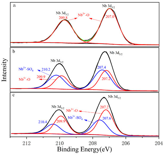 Figure 4a shows the Nb 3d orbital photoelectron spectrum collected from the columbite-(Fe) surface. The green curve was the total peak after sub-peak fitting. The Nb 3d orbitals exhibited double peaks corresponding to Nb 3d3/2 and Nb 3d5/2 double peaks which appeared at 209.8 eV and 207.0 eV, respectively. Nb 3d5/2 made an obviously main contribution. Figure 4b shows the Nb 3d orbital photoelectron spectrum of the 8 M H2SO4 acid leaching residue. The Nb 3d5/2 orbitals corresponding to the peak binding energy of Nb5+-SO4 was 207.4 eV, which was 0.2 eV larger than that of Nb5+-O with 207.2 eV. Figure 4c shows the Nb 3d orbital photoelectron spectrum of the 12 M H2SO4 acid leaching residue, and the binding energy was 207.2 eV and 207.6 eV corresponding to Nb5+-O and Nb5+-SO4, respectively. Nb5+-SO4 was formed during the H2SO4 acid leaching process; the main peak of Nb5+-SO4 on the residue surface was shifted from 207.4 eV for 8 M H2SO4 to 207.6 eV for the 12 M H2SO4 acid content, which meant O in Nb-O was easily replaceable with the -SO4 bond with the concentrated H2SO4 acid increasing.