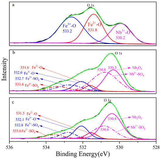 The photoelectron spectrum of columbite-(Fe) fitted O 1s orbital with three components is shown in Figure 5, and the three chemical elements’ state combined with oxygen, namely, Fe3+-O, Fe2+-O and Nb5+-O, with the corresponding electron binding energy decreased in proper sequence, namely, 533.2 eV, 531.8 eV and 530.2 eV, respectively. The binding energy of the bond structure of Fe2+-O on the 8 M residue was 533.4 eV, which was shifted 0.2 eV compared to columbite-(Fe). Fe3+-O and Nb5+-O and the corresponding electronic binding energy were 532.7 eV and 530.4 eV in sequence. The increased three photoelectron spectra meant the different valence in the 8 M residue. The binding energy of Fe2+-O, Fe3+-O and Nb5+-O on the 12 M H2SO4 acid leaching residue surface was 533.6 eV, 532.9 eV and 530.8 eV, respectively. Fe-O shifted to 0.2 eV increasing and Nb-O shifted 0.4 eV increasing from the 8 M residue to the 12 M one.