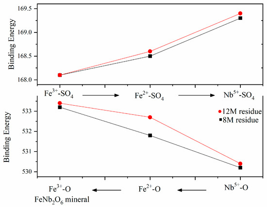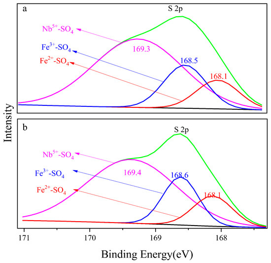 Figure 7a,b show the S 2p orbital photoelectron spectra of the 8 M H2SO4 and 12 M H2SO4 leaching residue, respectively. Naked Fe3+, Fe2+ and Nb5+ in the mineral surface contacted with SO42− and formed bonds. The binding energy of Fe3+-SO4, Fe2+-SO4 and Nb5+-SO4 on the 8 M H2SO4 leaching residue surface was 168.1 eV, 168.5 eV and 169.3 eV, respectively, and that on the surface of the 12 M H2SO4 leaching residue was 168.1 eV, 168.6 eV and 169.4 eV, respectively. The electron binding energy of Nb5+-SO4 was higher than that of Fe3+-SO4 and Fe2+-SO4, which meant the structure Nb5+-SO4 was the most stable. The formation of Nb5+-SO4 would promote the breakdown of Nb5+-O on the mineral surface during H2SO4 leaching. The binding energy of Fe3+-SO4 was 0.4 eV larger than that of Fe2+-SO4. The metal ion pairing SO42− in sequence was Fe3+-SO4 < Fe2+-SO4 < Nb5+-SO4 as shown in Figure 7.