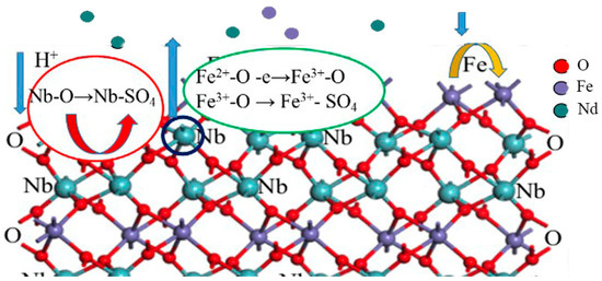 The results of the Nb dissolution from the mineral indicated that Nb5+-O was directly digested by H+, and the released Nb5+ complex with SO42− ion formed cation−anion pairs. The ratio of Nb5+-SO4 was 55.1% with Nb5+-O accounting for 44.9% on the 8 M H2SO4 acid leaching residue surface. The ratio of Nb5+-SO4 was 36.6% and Nb5+-O of 63.4% on the 12 M H2SO4 acid leaching residue surface. It was because the quantity of molecular H2SO4 in the bulk with concentrations of above 12 M lessened the ionization species of SO42− and HSO4−. The result indicated that the dissolution of Nb from the mineral owed to the content of H+ in the solution. In the 8 M sulfuric acid solution, there contained more species of H+, SO42−, which meant more Nb5+-SO4 was formed. The leaching reaction mechanism shows as follows: