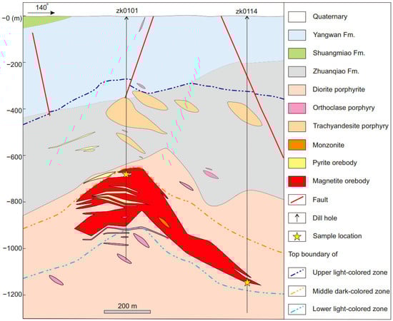 The Shaxi porphyry Cu–Au deposit, located ~15 km north of the Nihe IOA deposit (Figure 1), is the only reported porphyry deposit formed in the middle stage porphyry mineralization at the MLYRMB so far []. The deposit contains a reserve of over 1 Mt Cu and 45 t Au, which is located at the depth of 400–830 m with 884 m in length and 49–483 m in width (Figure 3; [,]). The orebody with 15°–35° in trend and 40°–60° in inclination, mainly developed in quartz diorite porphyry, is irregularly lenticular and locally lamellar in profile. The alteration at Shaxi has obvious zones, including potassic alteration (K–feldspar–biotite–magnetite–anhydrite ± quartz), propylitic alteration (chlorite–epidote ± albite ± illite ± calcite ± anhydrite), phyllic alteration (sericite–anhydrite–calcite), and argillic alteration (kaolinite–clay minerals) []. The propylitic alteration is often superimposed by phyllic alteration (Figure 3; []). Mineralization consists of three stages: the potassic stage, with the occurrence of K–feldspar–biotite–magnetite–quartz–anhydrite ± pyrite ± chalcopyrite; the quartz sulfide stage, which is the main mineralization stage, characterized by chalcopyrite–quartz–chlorite–epidote–pyrite; and the late quartz–carbonate stage containing quartz–carbonate–anhydrite–clay mineral ± chalcopyrite [,,].