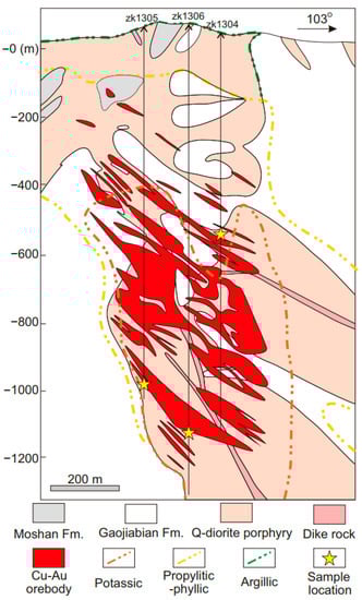 Figure 3. Geological map of the Shaxi porphyry deposit (modified after []). Abbreviations: Fm. = Formation.