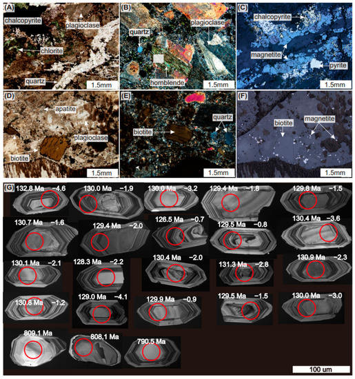 Two diorite porphyry samples with disseminated-veined magnetite and veined-spotted magnetite were collected from drill cores ZK0114-1130 and ZK0101-667 (Figure 2 and Figure 4A–F) at Nihe. At Shaxi, three quartz diorite porphyry samples with veined-disseminated chalcopyrite–magnetite–pyrite were collected from drill cores ZK1306-1128, ZK1305-979, and ZK1304-518 (Figure 3 and Figure 5A–F). Zircons from the samples mentioned above were separated by standard density and magnetic separation techniques, and representative zircon grains were mounted in epoxy resin. To select the best location for further analysis, zircon was photographed by the transmitted and reflected light at the Institute of Geology and Geophysics, Chinese Academy of Sciences, and zircon cathodoluminescence (CL) images were taken at the Wuhan SampleSolution Analytical Technology Co., Ltd., (Wuhan, China), Hubei in China (Wuhan SampleSolution).