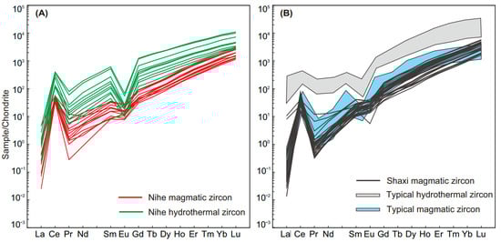 Figure 6. Chondrite-normalized REE patterns of zircons from the porphyry of Nihe (A) and Shaxi (B).