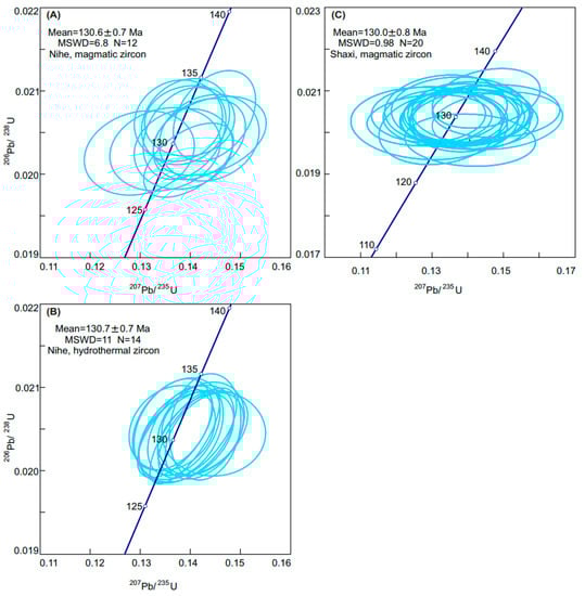 The Nihe magmatic zircons provide a U–Pb age of 130.6 ± 0.7 Ma (MSWD = 6.8; Figure 7A; Table S2), indistinguishable from previous zircon U–Pb ages, i.e., 132.4 ± 1.5 Ma and 132.8 ± 2.6 Ma [,]. The hydrothermal zircon U–Pb age of 130.7 ± 0.7 Ma (MSWD = 11; Figure 7B; Table S2) is consistent with the mineralization age determined by the phlogopite 40Ar-39Ar (130.9 ± 2.6 Ma; []). As such, the U–Pb ages are interpreted to represent the emplacement and mineralization ages of the Nihe diorite porphyry. Zircon from the Shaxi porphyry Cu–Au deposit provides a U–Pb age of 130.0 ± 0.8 Ma (MSWD = 0.98; Figure 7C; Table S2). Within uncertainty, it is indistinguishable from previous zircon U–Pb ages, i.e., 129.4 ± 1.4 Ma and 129.5 ± 1.0 Ma [,], and the mineralization age determined by the molybdenite Re–Os (130.0 ± 1.0 Ma; []). Therefore, the U–Pb age could represent the emplacement and mineralization ages of the Shaxi quartz diorite porphyry. The excellent agreement between the porphyries’ emplacement and mineralization ages of the Nihe IOA deposit and the Shaxi porphyry Cu–Au deposit shows that these deposits formed at the same time.