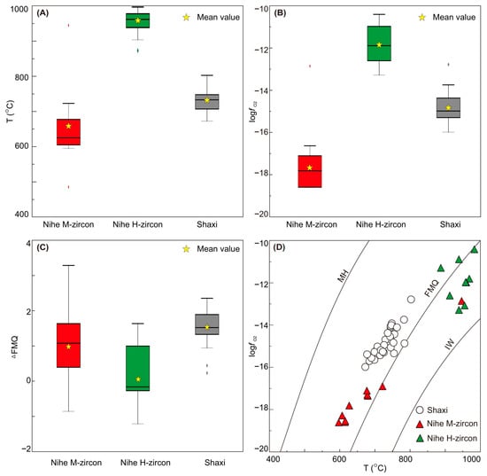 Figure 8. Box plots for zircon crystallization temperature (A), log fO2 (B), and ΔFMQ (C). Diagram of zircon T (°C)-log ƒO2 (D). The zircon T(°C) and log ƒO2 were calculated using the method of Ferry and Watson [] and Loucks et al. []. Abbreviations: M-zircon = magmatic zircon, H-zircon = hydrothermal zircon.