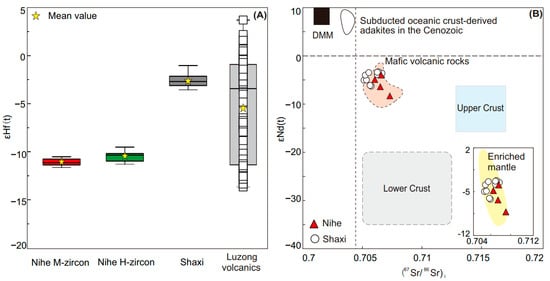 Figure 9. Box plot for zircon εHf(t) of the porphyry in Nihe and Shaxi (A). For comparison, the basaltic andesites of the Zhuanqiao Formation at the Luzong Cretaceous volcanic basin [], Lower Yangtze Valley, are also shown. Initial 87Sr/86Sr vs. ɛNd(t) plot of the porphyries in Nihe and Shaxi (B). Data sources for the Cenozoic adakites attributed to the melting of the subducting oceanic crust are from Wang et al. [], and those for the enriched mantle are from Xie et al. []. Abbreviations: M-zircon = magmatic zircon, H-zircon = hydrothermal zircon.