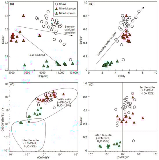 Figure 10. Diagram of zircon trace elements on Hf vs. Eu/Eu* [] (A) and Yb/Dy vs. Eu/Eu* [] (B). Diagram of zircon Eu/Eu* vs. (Ce/Nd)/Y (C) and 10,000 × (Eu/Eu*)/Y vs. (Ce/Nd)/Y (D). The zircon trace element ranges to define high oxygen fugacity–high water content fertile magma (ΔFMQ > 2 and H2O < 12%) and low oxygen fugacity–low water content (ΔFMQ < 2 and H2O < 5%) infertile suite refer to []. Abbreviations: M-zircon = magmatic zircon, H-zircon = hydrothermal zircon.