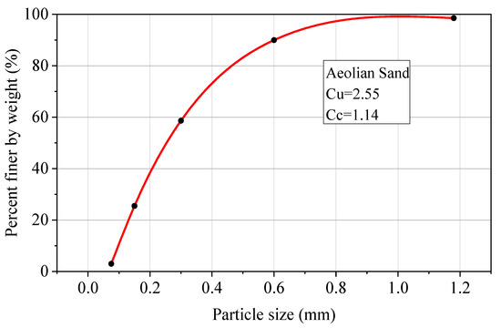 The aeolian sand used in this research came from the stockyard in Tacheng, Xinjiang. The density of gravel was 2.5 g/cm3.The distribution of the particle size of the aeolian sand is shown in Figure 1. The particle size distribution generally refers to the percentage of particles with different sizes in the total particles in the powder sample reflected using specific instruments and methods. In this investigation, the particle size distribution of aeolian sand was determined using a sieving method, according to GB/T50123-2019 [36]. It was between 0.075 and 0.6 mm, and its content was as high as 90%. From this figure, it could be understood that the number of particles larger than 0.6 mm was very low and the particles smaller than 0.075 were less than 3% of the total. Referring to soil mechanics, soil with an uneven gradation coefficient Cu > 5 and curvature coefficient (Cc) of the gradation curve in the range of 1 to 3 is well-graded [37]. The Cu of the investigated aeolian sand was 2.55. Therefore, based on the mentioned classification method, the aeolian sand was categorized as poorly graded sand.