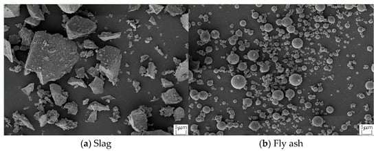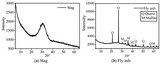 The characterization of fly ash and slag was carried out using SEM and XRD analysis. The powder samples were subjected to a high-resolution field emission scanning electron microscope device for SEM analysis. The powder samples were also subjected to XRD analysis to obtain microstructural information on amorphous and crystalline phases. The XRD scans were performed at 0–60° 2θ using a D/MAX-220PC device. The XRD analysis was carried out by scanning at 5° 2θ per min and at steps of 0.04° 2θ. The voltage and current of the XRD analysis were set to 40 kV and 20 mA, respectively.