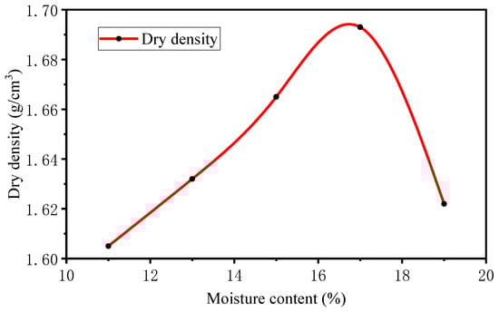 Table 3 presents the mix design of solidified aeolian sand. The ratio of water to solid in cement was 0.5. The water consumption for the preparation of geopolymer was determined according to the selected ratio of Si2.5N0.8, and the ratio of water to solid (w/s) was 0.46. Here, the ratio was calculated as the water in the activator divided by the mass of solids (fly ash + slag + solids in the activator). For the pavement base material, it was necessary to determine the optimum moisture content of the material through compaction test to ensure that the material reached the maximum compactness. Therefore, a set of compaction tests was carried out to determine the maximum dry density and the corresponding optimum water content (OWC) for each case, which was necessary to be known in advance for preparing the stabilized aeolian sand samples. The compaction test adhered to the Chinese National Standard JTG 3430-2020. The relationship between moisture content and dry density of aeolian sand is shown in Figure 5. The optimal moisture content of aeolian sand is 17%, and the corresponding maximum dry density is 1.693 g/cm3. For geopolymer-stabilized aeolian sand, the geopolymer paste was prepared and poured into sand at the predetermined w/s ratio (0.46). Then, extra water was added to the mix to meet the OWC. The proportion of slag–fly ash geopolymer was 10%, 15%, and 20%, represented by G10, G15, and G20, respectively. On the other hand, C5, C10, and C15 represent the aeolian sand with 5%, 10%, and 15% cement content. It should be noted that they were used as control samples.