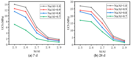 The unconfined compressive strength of the paste specimen is shown in Figure 6. When the Na/Al ratio was 1.0, increasing the Si/Al ratio decreased the unconfined compressive strength of the slag–fly ash geopolymer. For an Si/Al ratio of 2.5 and Na/Al ratio of 1.0, the UCS of slag–fly ash geopolymer was the highest, and the strength after curing times of 7 and 28 days was 14 MPa and 27 MPa, respectively. With the gradual decrease in the Na/Al ratio, the UCS of slag–fly ash geopolymer also decreased. When the Na/Al ratio was 0.7, the compressive strength dropped sharply. This was because of the lower concentration of NaOH and Na2SiO3. All of that resulted in a slow gel formation in early geopolymerization and a decreased strength of the paste.