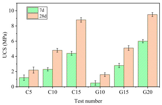 Figure 7 shows the change in the unconfined compressive strength of solidified aeolian sand (stabilized by cement (denoted as C) or geopolymer (denoted as C)) with curing time. Due to the increase in content of cementing materials (from 5% to 15%), the chemical reaction was promoted to produce more gel-like materials, which significantly improved the strength. The improvement of solidified aeolian sand strength was related to chemical reactions (hydration or geopolymerization) in a solidified mechanism. With the extension of the curing age, the reaction degree was increased, and more gel materials were produced. The new skeleton was formed to support the aeolian sand body, so that the strength of aeolian sand as the primary material of the road base was constantly improved.